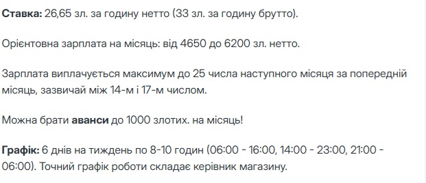 Так, согласно объявлению, ориентировочная зарплата на такой работе составит 4650 до 6200 зл. нетто (после вычета налогов). В переводе на гривны: 54 870 — 73 160.