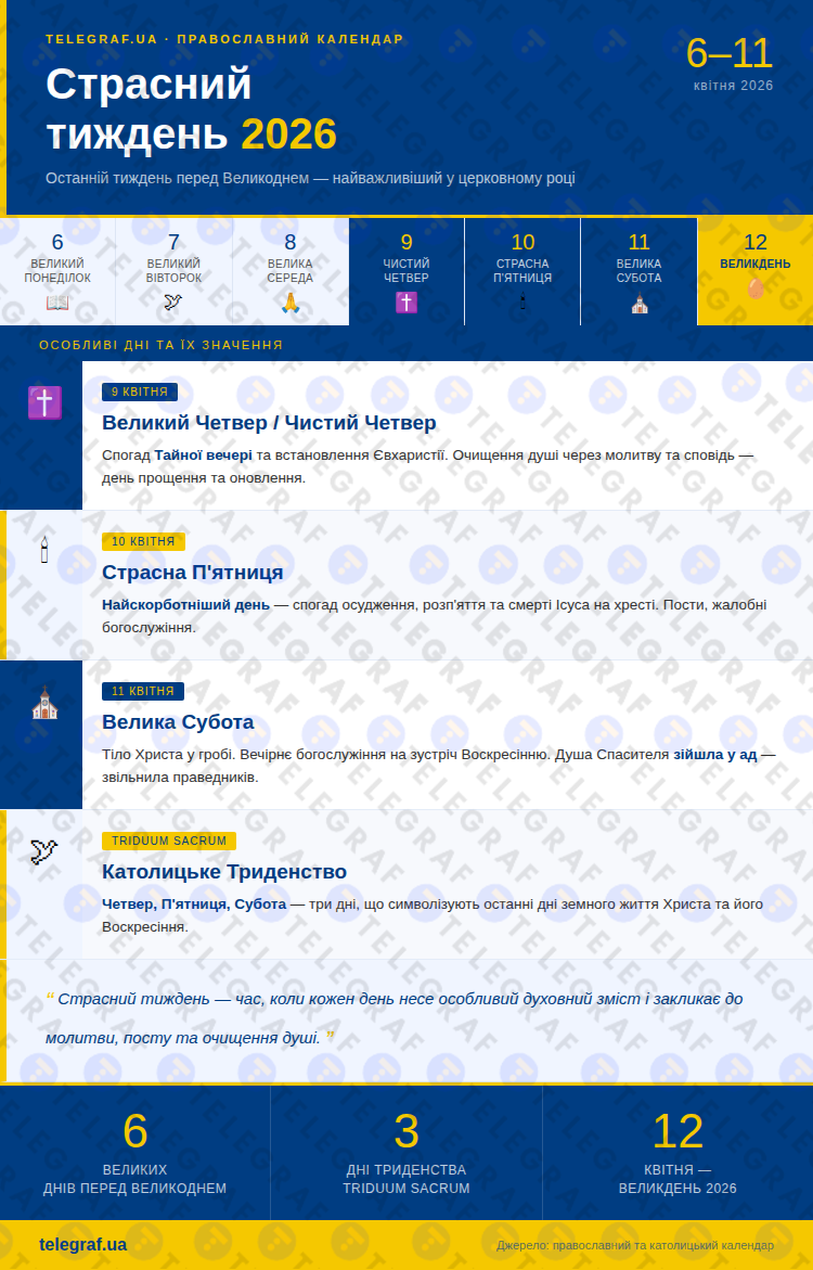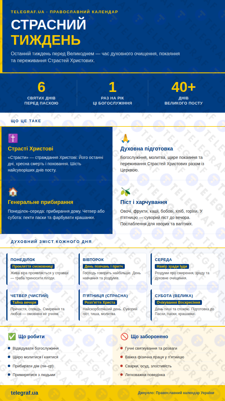 В этом материале "Телеграф" детально рассказывает о названиях каждого дня недели. Их традиционно называют Великими: Великий понедельник (Великий понеділок), Великий вторник (Великий вівторок), Великая среда (Велика середа), Великий четверг (Великий четверг), Страстная пятница (Страсна пя́тница), Великая суббота (Велика субота) и Пасха (Великдень).