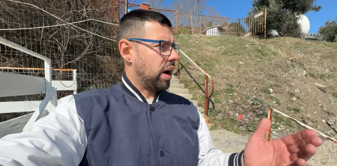 Позади автора можно увидеть заброшенный склон с мусором. Он рассказывает, что россияне построили в Кацивели две жилые многоэтажки. Россиянин надеется, что на первых этажах откроют супермаркеты, потому что соскучился по скидкам и дисконтным программам.
