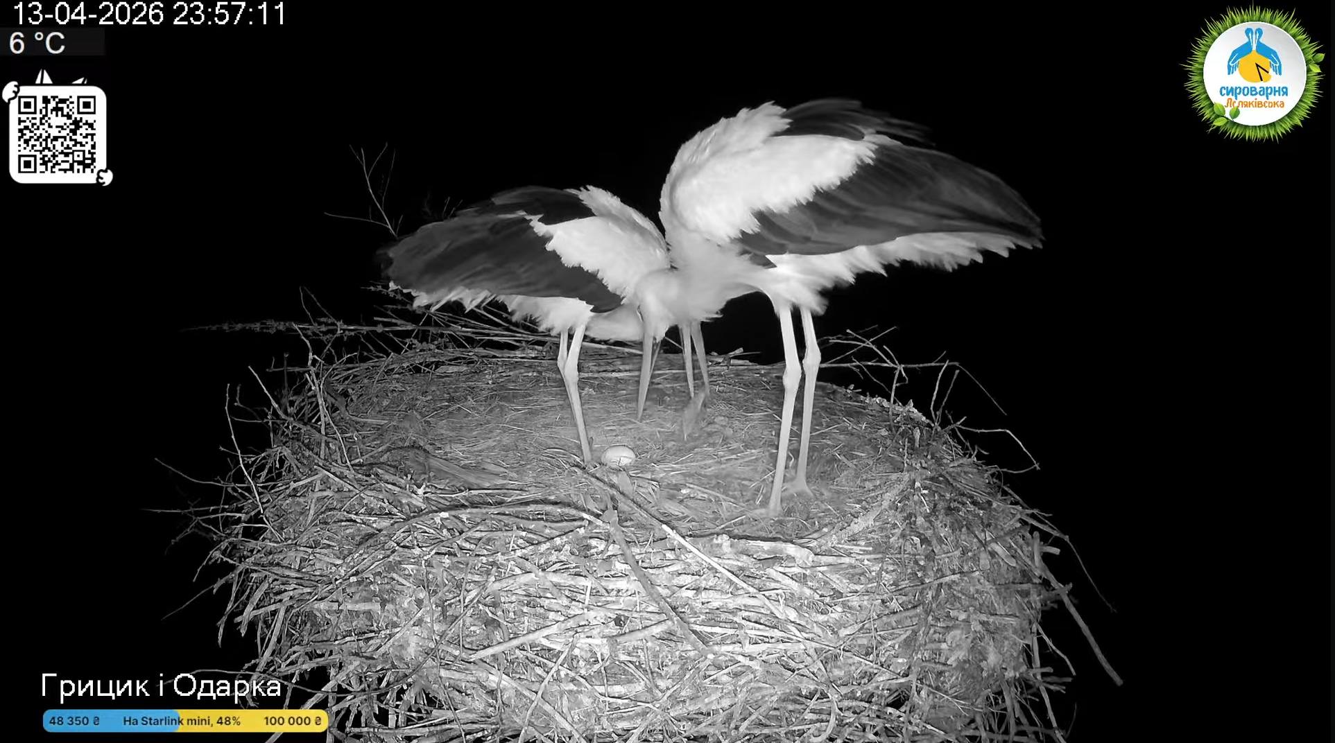 О появлении первого яйца в гнезде аистов рассказала исследовательница птиц Ирина Саражинская. Оно появилось в 23:54 13 апреля.