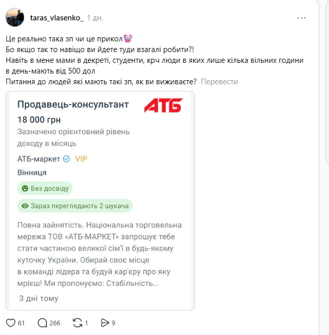 Обсуждения развернулись в социальной сети Threads. Так, на одном из сайтов для поиска работы появилась вакансия продавца-консультанта в магазин "АТБ". Указанная ориентировочная месячная зарплата за такую работу была объявлена на уровне 18 тысяч гривен.