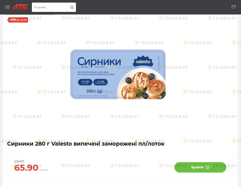 Известная сеть супермаркетов продает замороженные сырники "Valesto" весом 280 грамм со скидкой в -40% — цена упала с 109,90 до 65,90 гривны. Акция должна завершиться уже 14 апреля, как узнал "Телеграф".