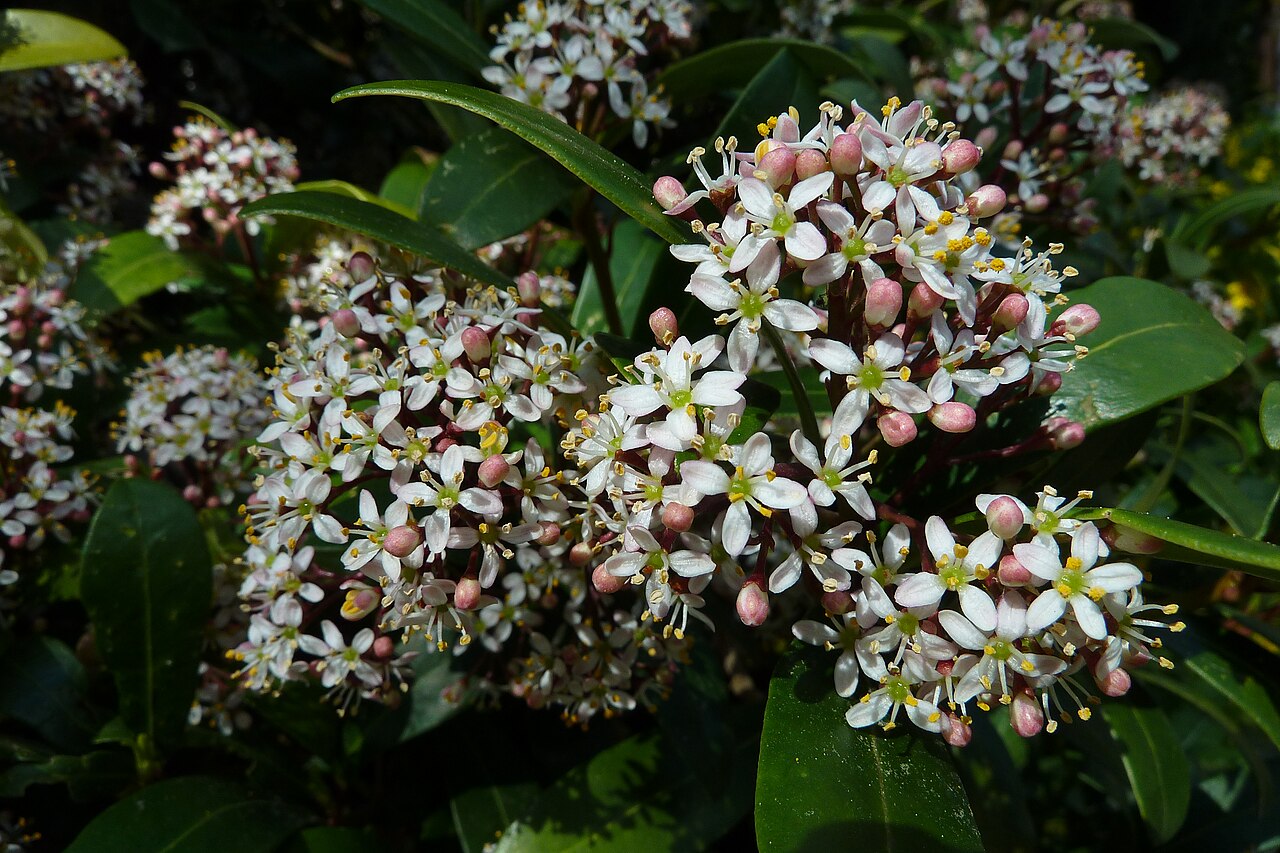 Скиммия не зря пользуется популярностью у входных дверей благодаря своим блестящим вечнозеленым листьям и гроздьям бутонов, которые раскрываются в ароматные цветы. Она прекрасно растет в тени и в контейнерах, неприхотлива в уходе и радует глаз круглый год.