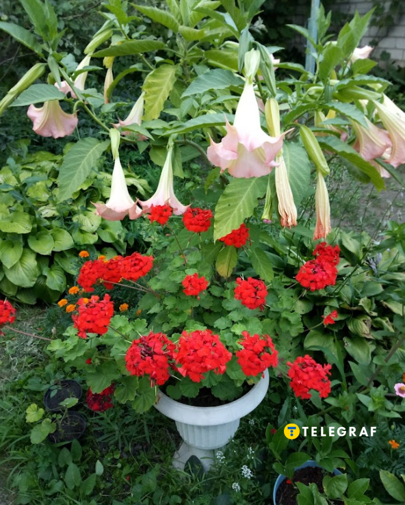 Пеларгония огненного цвета в компании с нежной бругмансией у входа в дом