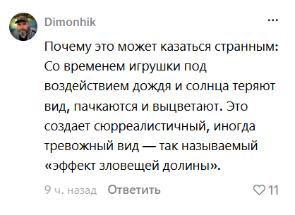 "Со временем игрушки под воздействием дождя и солнца теряют вид, пачкаются и выцветают. Это создает сюрреалистичный, иногда тревожный вид — так называемый "эффект зловещей долины".