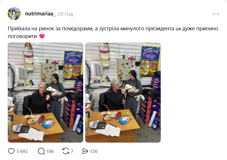 А недавно Ющенко снова заметили на рынке в Киеве. Пользовательница соцсети Threads под ником "nutrimariaa" опубликовала новые фото с Виктором Андреевичем и рассказала, что встретила его на рынке.