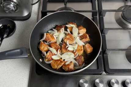 Популярный подход состоит в том, чтобы сначала обжарить лук на разогретой сковороде. В таких условиях она приобретает золотистый цвет и легкую карамельную сладость. После этого к ней добавляют мясо, впитывающее аромат обжаренного овоща. Этот способ лучше всего подходит для быстрого приготовления нежных видов мяса, не требующих длительного тушения.