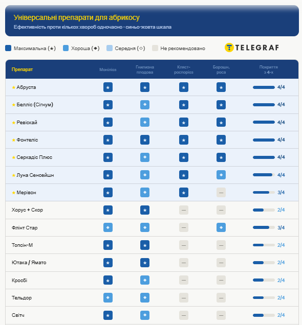 Чем обработать абрикос от клястероспориоза? Самые действенные препараты — Луна Сенсейшн, Меривон, Беллис (Сигнум), Ревискай, Серкадис Плюс, Абруста, Фонтелиіс, а также дитиокарбаматы (Полирам, Манзат, Целитель и др)