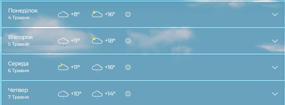 В понедельник, 4 мая, прогнозируют +17 °C днем и +8 °C ночью, местами возможен небольшой дождь. На следующий день, 5 мая, температура немного повысится до +18 °C, но небо будет преимущественно облачным. Наиболее нестабильной будет среда, 6 мая: воздух прогреется до +21 °C, однако ожидается дождь с высокой вероятностью осадков до 70%.