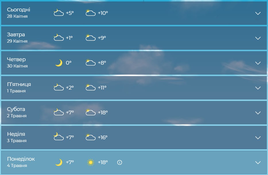 В течение 28-29 апреля будет еще довольно прохладно — днем +12 … +13 °C, ночью +3 … +4 °C. Преобладает облачность, но без существенных осадков.
