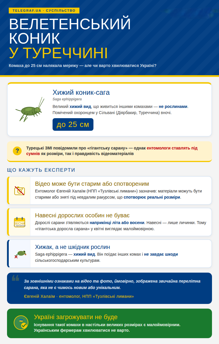 Энтомолог Национального природного парка "Тузловские лиманы" Евген Халаим в комментарии "Телеграфу" отметил, что по внешним признакам на видео и фото, вероятно, изображена обычная перелетная саранча, которая не является чем-то новым или уникальным. Кроме того, материалы могут быть либо старыми, либо сняты под неудачным ракурсом, искажающим реальные размеры.