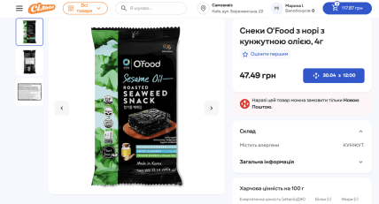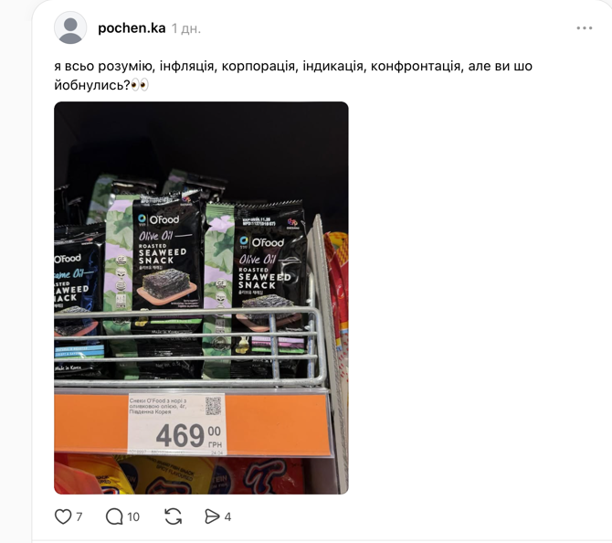 Автор опубликовал фото из отдела азиатских продуктов, где маленькая пачка снеков нори бренда O’Food весом всего 4 грамма выставлена с ценником в 469 гривен.