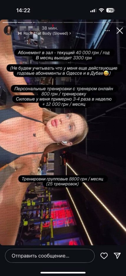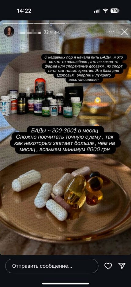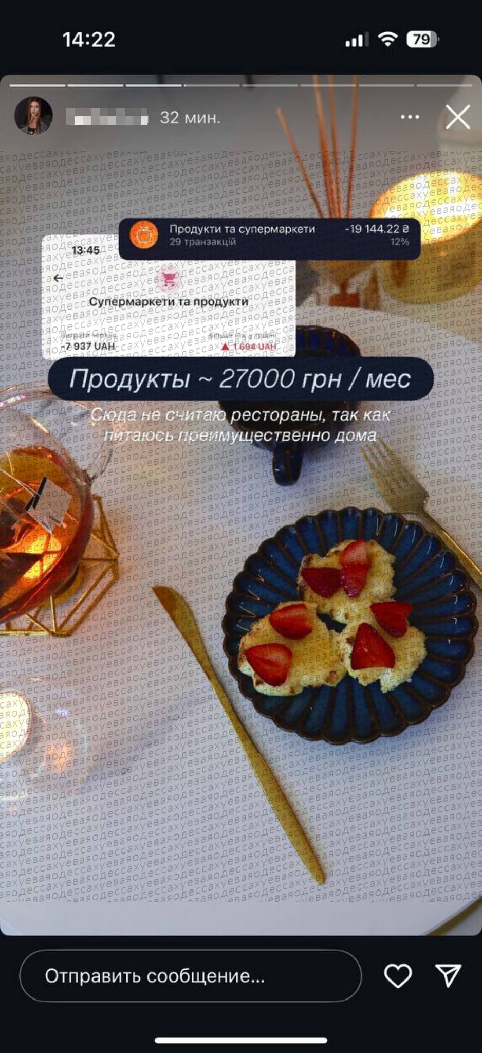 Одесситка обнародовала в своем Instagram подробный отчет о том, сколько стоит ее содержание в месяц — сумма поразила многих и составила 60 000 гривен. Она подробно расписала свои расходы, включая питание, спортивные добавки, тренировки и массажи.