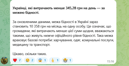 Пользователи также обратили внимание на социальный контекст, отмечая, что предел бедности в Украине сейчас составляет около 10 358 гривен в месяц на одного человека, и многие граждане живут значительно скромнее.