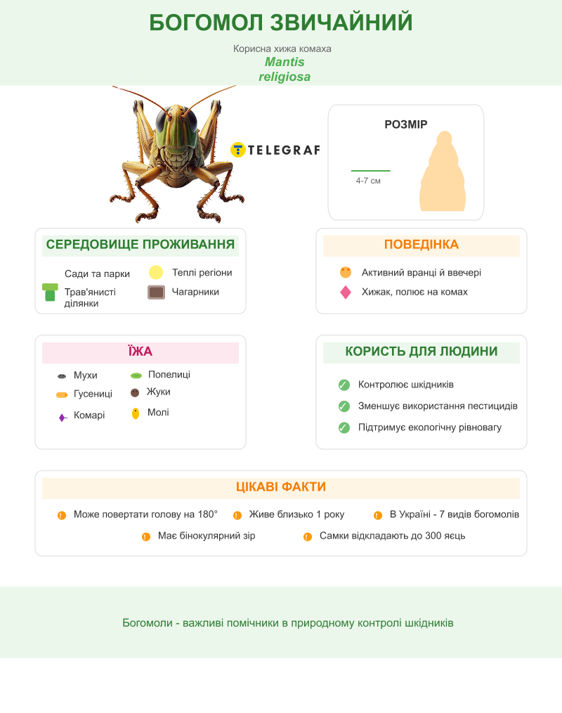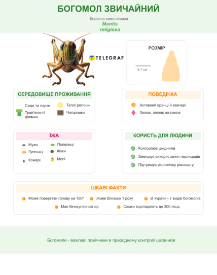Богомол обыкновенный может достигать 4-7 см в длину. Это насекомое отличается характерной позой с приподнятыми передними лапами, за что и получило свое название.