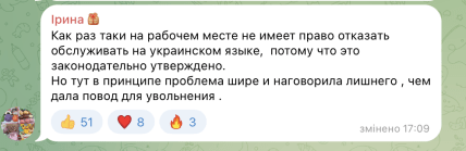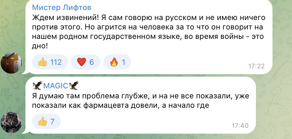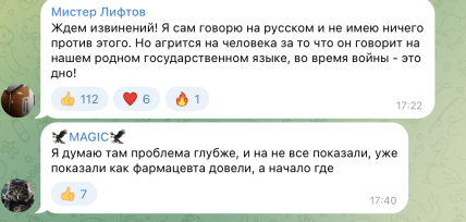 В комментариях пользователи были возмущены поведением фармацевта. Они отмечали, что хоть и сами говорят на русском, но не видят проблемы в том, что обслуживать следует на украинском. Однако были и те, кто принял сторону фармацевта, заявив, что покупатель "вывела продавщицу".