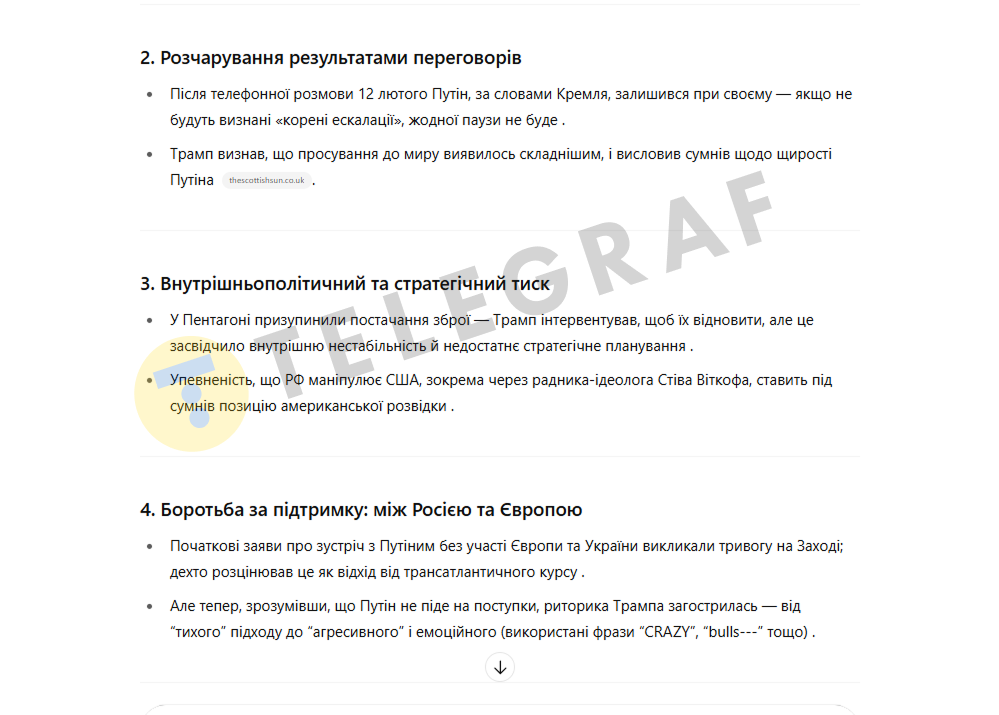 Второй причиной ChatGPT называет разочарование результатами переговоров. Американский лидер уже признал, что Путин не желает завершать войну, больше путь к миру в Украине оказался более тернистым.