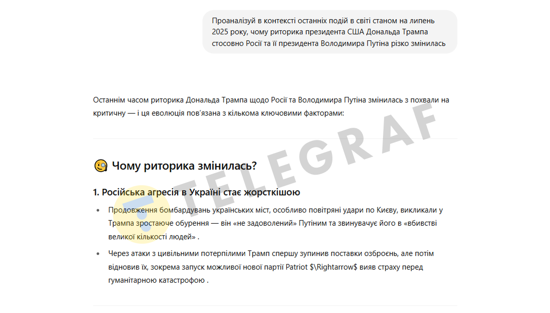 "Телеграф" попросил искусственный интеллект ChatGPT проанализировать резкое изменение риторики Трампа на критическую. ИИ выделил пять основных причин для этого, и не все они напрямую связаны с Украиной.