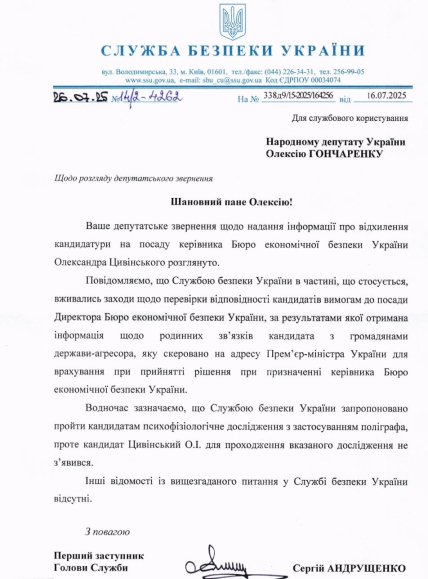 Обновлено. Нардеп Гончаренко сообщил, что получил ответ от СБУ, где спецслужба заявляет, что Цивинский должен был пройти полиграф, но не явился.