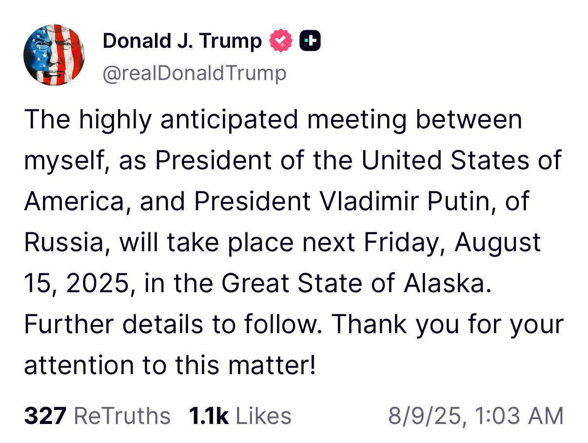 "Очень ожидаемая встреча между мной, как президентом Соединенных Штатов Америки, и президентом России Владимиром Путиным, состоится в следующую пятницу, 15 августа 2025 года, в Великом штате Аляска. Более подробные детали будут дальше. Спасибо за внимание к этому вопросу!"