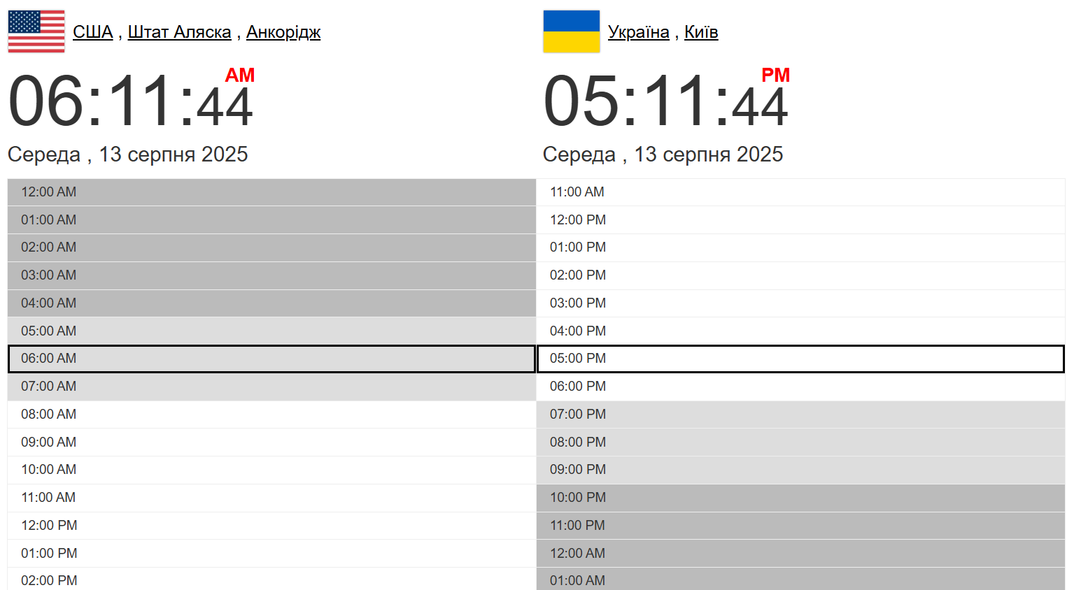 Анкоридж, где должен пройти саммит, находится во часовом поясе Аляски (AKST), который отстает от киевского на 11 часов. Это означает, что если встреча начнется, например, в 14.00 по местному времени, в Киеве будет 01.00 на следующий день. Если переговоры запланированы на более позднее послеобеденное время, украинцы могут следить за событием в период утра, примерно с 02:00 до 05:00.