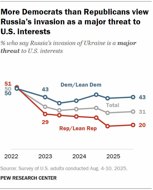 Также значительно возросла доля сторонников варианта, что США несут ответственность за безопасность Украины и предоставление Киеву нужной военной помощи. Как и с предыдущим пунктом, особенно сильный рост отмечается среди республиканцев. Аналогичная ситуация сложилась по вопросу, есть ли Россия и ее вторжение в Украину прямой угрозой Соединенным Штатам — доля сторонников того, что есть, выросла до 31%, тогда как доля "неверующих" упала до 11%.