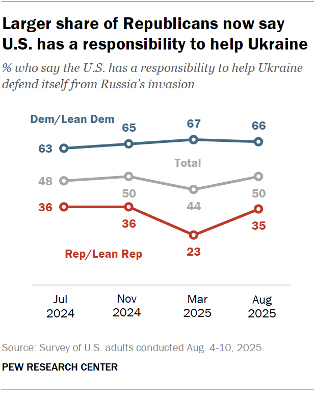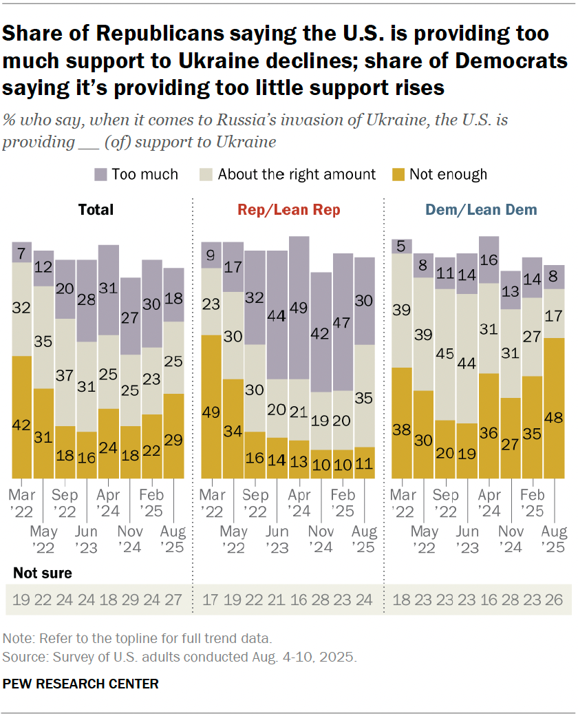 Также 29% респондентов считают, что США оказывают Украине мало поддержки, тогда как 18% — наоборот, слишком много. Отмечается, что по сравнению с прошлыми опросами среди сторонников разных партий почти одновременно значительно возросла доля тех, кто считает, что США делает слишком мало для Украины. А вот доля тех, кто считает, что США делает многовато, наоборот, уменьшилась — что интересно, главным образом среди приверженцев Республиканской партии, которая привела Трампа к власти.