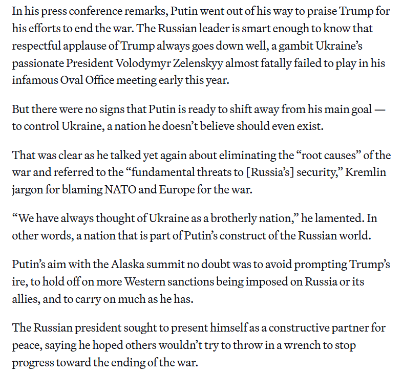 "С тех пор, как Дональд Трамп и Владимир Путин сошли с самолетов на авиабазе времен Холодной войны вблизи Анкориджа, их публичные жесты были удивительно дружественными: президент США аплодировал российскому вождю, они обменялись улыбками, похлопыванием по плечу, живой, но явно дружелюбной.