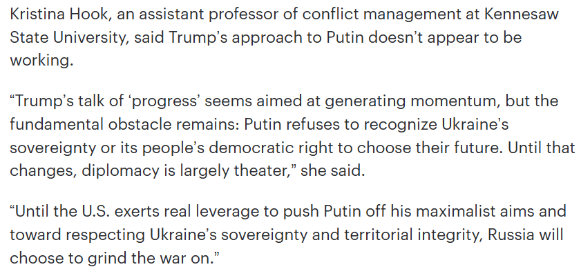 Кристина Гук, ассистентка профессора по управлению конфликтами в Университете Кеннессо, считает, что подход Трампа к Путину, похоже, не работает.