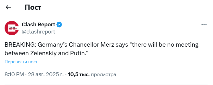 В четверг, 28 августа, канцлер Германии Фридрих Мерц заявил, что встречи президентов Украины и России Владимира Зеленского и Владимира Путина не будет.