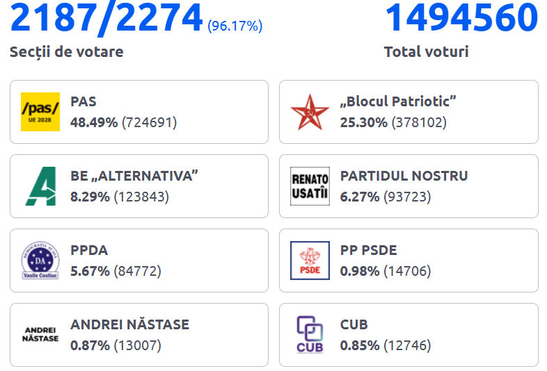 Об победе партии Санду свидетельствуют данные Центральной избирательной комиссии Молдовы. По данным ЦИК, после подсчета 96% бюллетеней ситуация выглядит следующим образом:
