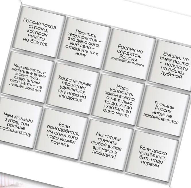 Среди фраз, которые разместили на обертках — "Своих не бросаем!", "Границы России нигде не заканчиваются", "Мы готовы принять любой вызов времени и победить!", "Если драка неизбежна, бить надо первым", "Меньше зубов — больше любишь кашу" и другие "перлы". Сам Дмитриев заявил, что передал конфеты американским переговорщикам — якобы в знак благих намерений России и "в рамках диалога".