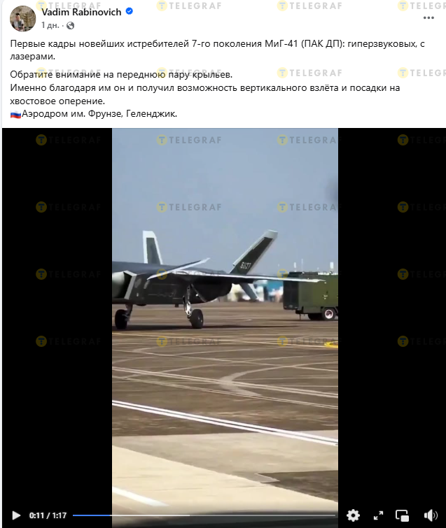Бывший народный депутат Вадим Рабинович, сбежавший в Израиль, распространил интересный фейк "о могуществе России". На своей странице в Facebook он опубликовал видео с подписью о "новейших российских истребителях 7-го поколения МиГ-41 с гиперзвуковыми возможностями и лазерами", якобы с аэродрома имени Фрунзе в Геленджике.