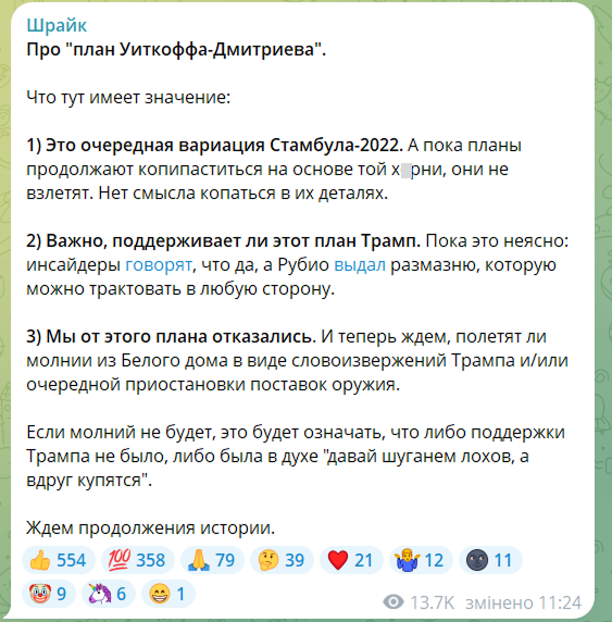 Украинский блоггер Роман Шрайк назвал план Уиткоффа-Дмитриева нежизнеспособным и череду вариацией переговоров в Стамбуле в 2022. Главная интрига — действительно ли план поддерживает Трамп. Он отметил, что госсекретарь США Марко Рубио "выдал размазню, которую можно трактовать в любую сторону".