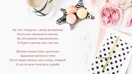 Настал твой день! Мажь ресницы тушью, губы − губнушкой💄, а щеки − маслом и начинай загадывать желания. А я желаю тебе, чтобы за все происходящее в жизни не приходилось платить, чтобы карма мгновенно накрывала твоих врагов, чтобы твои фантазии поскорее осуществились⭐️, и чтобы рядом всегда находился именно тот, кого ты хочешь видеть в данную минуту💖. Желаю сегодня отлично повеселиться, получить много разных подарков🎁, а то, что не подойдет по размеру тебе, тут же отдать своей лучшей подруге. С днем рождения! От самой лучшей подруги🎈.