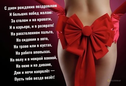 "Телеграф" подготовили для пикантные и веселые поздравления в прозе и стихах, которые точно вызовут улыбку на лице виновника торжества. А если хочется сделать сюрприз еще ярче, можно отправить имениннику пошлую открытку с днем рождения. Выбирайте понравившееся поздравление и смело отправляйте виновнику торжества.