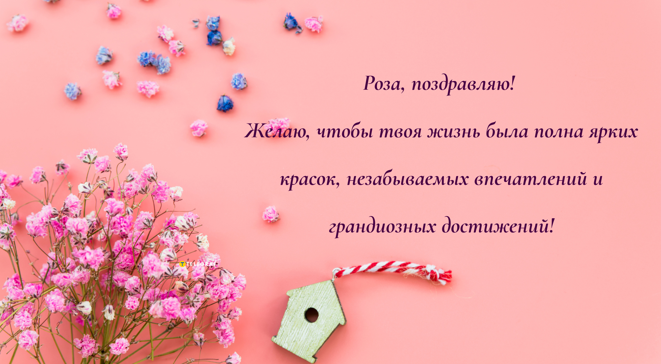 Роза, с праздником! 🌺 Пусть этот день принесет тебе яркие впечатления, добрые слова и приятные эмоции. Желаю тебе сил, вдохновения и нескончаемой энергии для исполнения всех желаний. С днем рождения!🌈