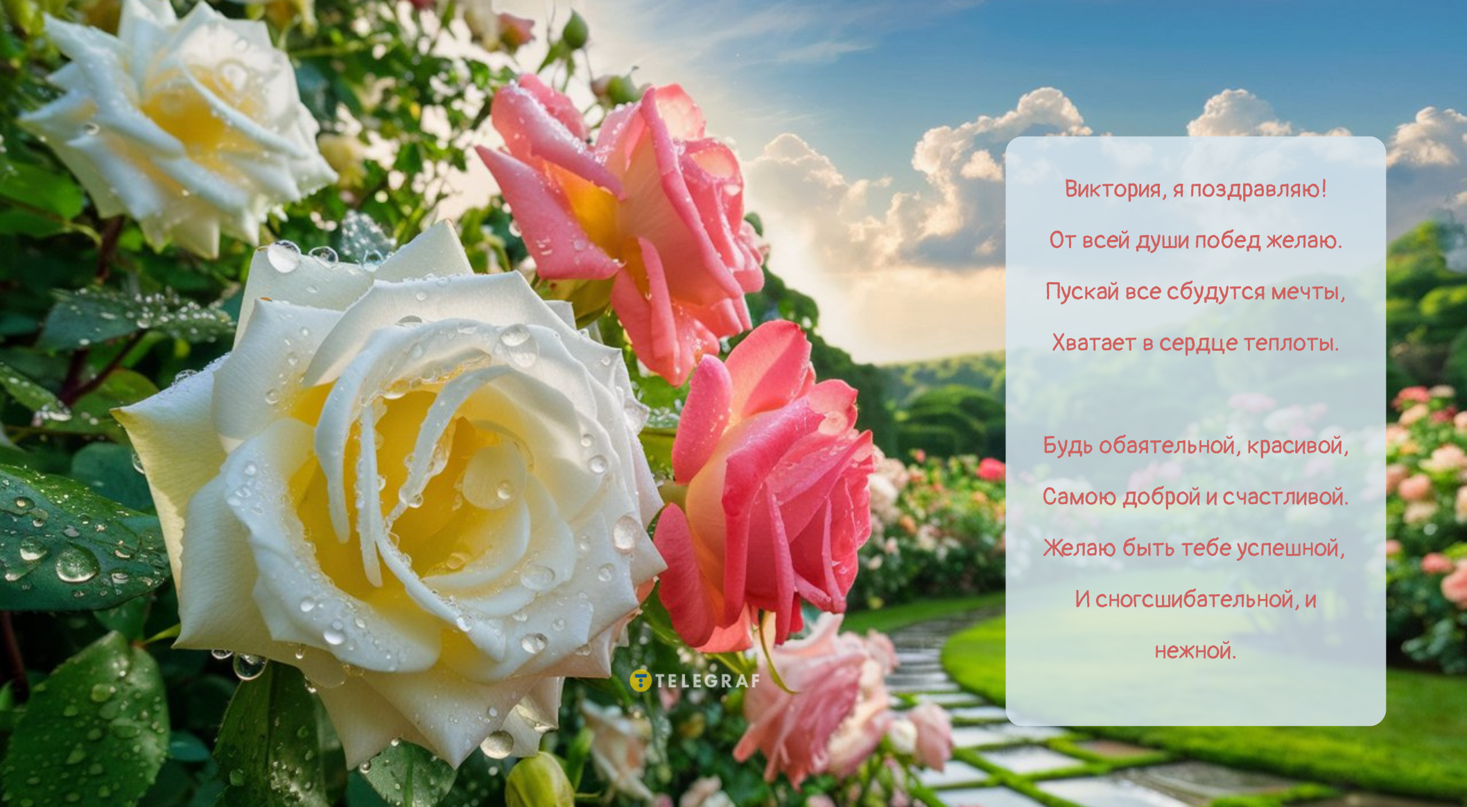Виктория, с днем рождения! 🥳 Пусть этот день будет наполнен улыбками, приятными сюрпризами и безграничным счастьем! Желаю тебе здоровья, удачи и исполнения всех самых заветных желаний. Будь всегда такой же прекрасной и вдохновляющей! ✨