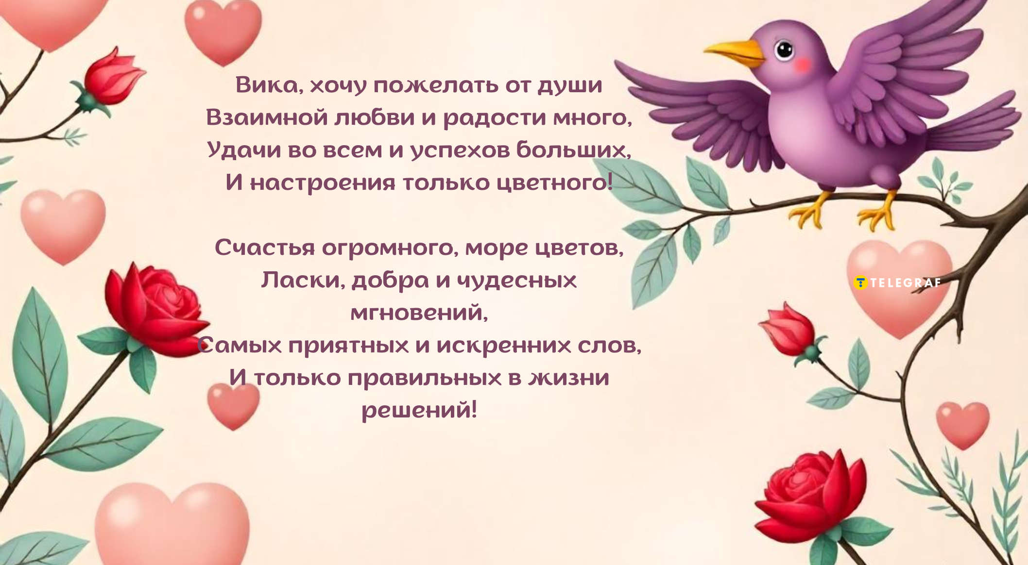 Вика, с днём рождения! Поздравляю с твоим днем! Желаю тебе всегда оставаться такой же прекрасной, доброй и отзывчивой. Пусть каждый новый день приносит тебе только хорошие новости и приятные события. Наслаждайся каждым моментом! 🥂