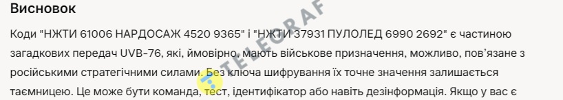 Он объяснил, что НЖТИ — это позывной станции, а числа — могут являться идентификаторами, координатами, командами или зашифрованными данными. Слова (НАРДОСАЖ, ПУЛОЛЕД), по мнению ИИ, выглядят как кодовые названия, возможно для операций, объектов или адресатов. Однако без ключа шифрования понять точный смысл невозможно.