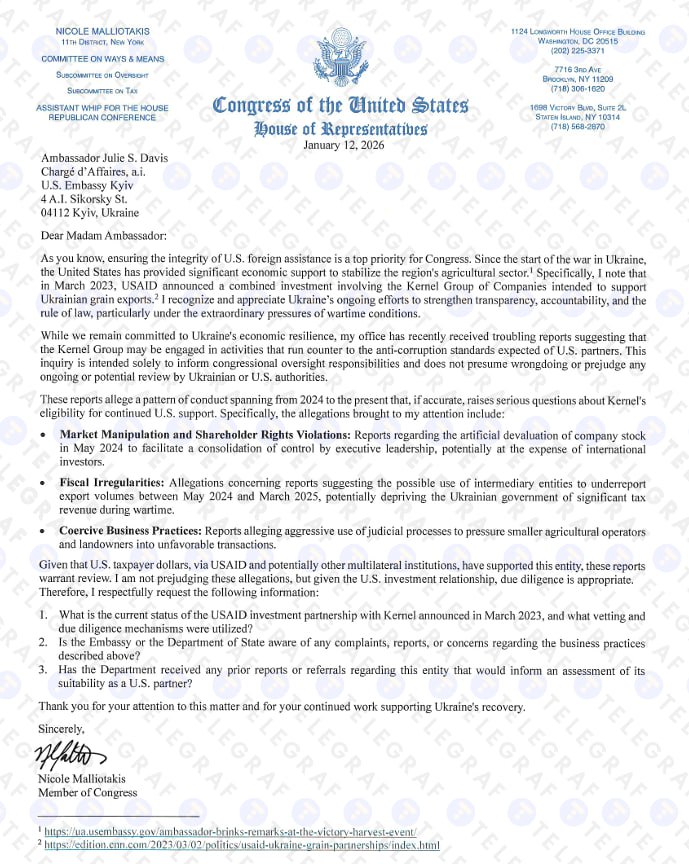 Член Палаты представителей США Николь Маллиотакис направила письмо временному поверенному в делах США в Украине Джули Дэвис с просьбой предоставить информацию о деятельности украинской аграрной группы Kernel.