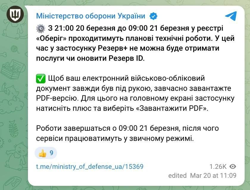 "С 21:00 20 марта до 09:00 21 марта в реестре "Оберіг" будут проходить плановые технические работы. В это время в приложении Резерв+ нельзя будет получить услуги или обновить Резерв ID", — говорится в заявлении.