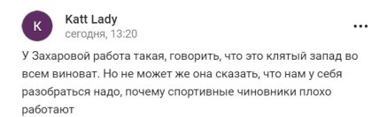 Соответствующий комментарий Захаровой приводит Р-Спорт. Мария назвала решение Спортивного арбитражного суда (CAS) по спортсменке "диким" и "несправедливым".