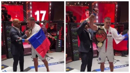 Поединок завершился победой Немкова удушающим приемом во втором раунде. После боя титул чемпиона россиянину вручал легендарный американский боксер Майк Тайсон, передает пресс-служба PFL в Instagram.