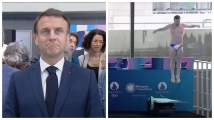 О конфузе сообщает francebleu.fr. В трансляцию мероприятия на видео попал неудачный синхронный прыжок в исполнении трех французских спортсменов и реакция президента Франции Эммануэля Макрона на него.