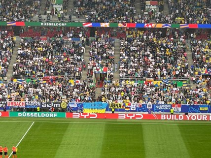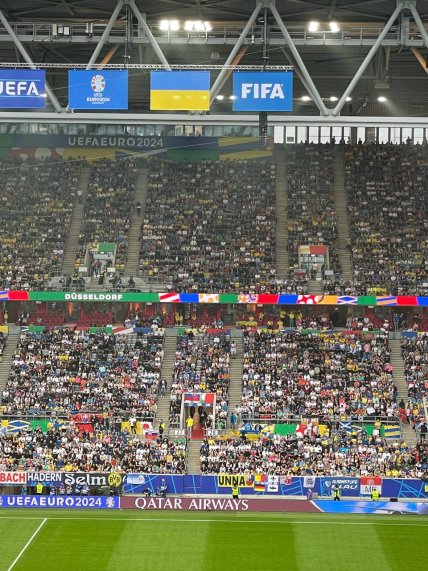Почти каждое спортивное событие не проходит без скандалов и провокаций, так произошло и 21 июня на чемпионате Европы-2024 по футболу на матче Словакия-Украина. Во время одного из таймов болельщики заметили украинский флаг с провокационной надписью.