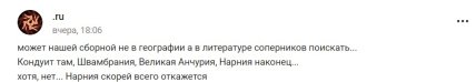 В сети лишь посмеялись над очередным унижением России на международном уровне. Пользователи шутят, что с командой РФ на данный момент готовы сыграть только вымышленные страны, к примеру Нарния.