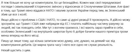 А проявляет ли Зеленский какое-нибудь признание или уважение взамен? Ничего. Он одевается как уличный парень, он пытается больше втянуть в соглашение о гарантиях безопасности. Трамп не пересекает красные линии, а вежливо выбивает его в угол: "Увидим". Он даже начинает обвинять Трампа в ситуации с Крымом, которая произошла в 2014 году до того, как тот оказался в Белом доме" – написал Кристенсен.