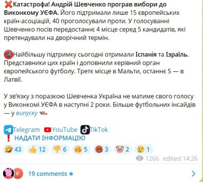 "Катастрофа! Шевченко проиграл выборы в Исполком УЕФА. Его поддержали всего 15 европейских стран-ассоциаций, 40 проголосовали против. В голосовании Шевченко занял 4 место среди 5 кандидатов, претендовавших на двухлетний срок", — написал Бурбас.
