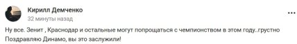 Отметим, "Динамо" Москва на данный момент идет на 5-м месте в турнирной таблице чемпионата РФ, отставая от лидера ("Краснодара") на 9 очков.